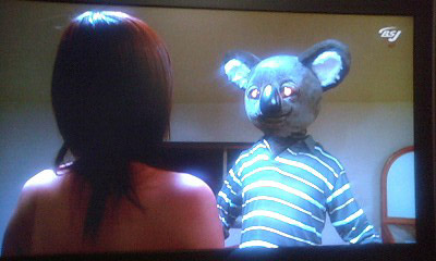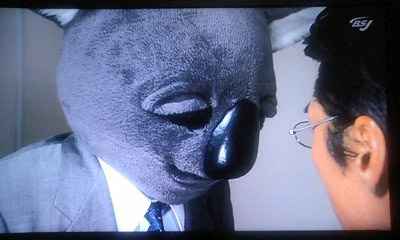 逃げる女性 追うコアラ あっ、こいつ女性だと思ってエロいことしようとしとる!! エロコアラー!!! 女性の右にある棚の上の置物 そう、あれです アレで思い切りボコー殴られるコアラ