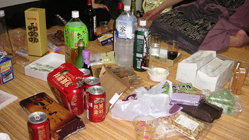 ・土曜の夜だけどそんなに混んでないね ・9人いるから机の切れる真ん中で自然と二組に分かれたような ・そして私たちの組の食べ物の並ぶ量が半端ねぇ ・向こうと比べてみ? ・倍はあるよ ・そしてどんどん平らげる ・だって私と柚姫さん飲めない分食べるもんね!? ・ガツガツ ・鳥のタタキ超しわ〜い(これ方言ですか?) ・タタキとか刺身とか馬刺とか、生もってこーい ・生もの大好き ・途中翔さんが唐揚げを見事にたまり醤油にダイブさせる ・ミラクル起きた! ・飛び込んだにも関わらず醤油が散るでもなく、こぼれるでもなく…! ・そして責任とって食べられました ・れーやんが欲しいと言ったのでうどん注文 ・箱庭風?? ・…稲庭風でした… ・どんな小人さんたちが住んでいるのかと ・メニュー逆から読んだからさ…!(いいわけ) ・柚姫さんが頼んだ明太子どんぶりのようなもの ・ビビンバみたいな感じの↑ (わかりづらい) ・稲垣さんが欲しそうにしたのでお裾分け ・が、皿がない ・う〜ん、どうしよう? ・あ、あるじゃない、ここに ・醤油入れが。 ・超ミニ皿が ・いっそ… ・山盛り入れて、もう一枚の皿で蓋をして、はい(ソ…) ・明太焼き飯パセリを添えて〜お供え風〜 ・10時過ぎたのでリスミンさんもそろそろ電車がなくなりそう ・じゃ、いったんお開きとしましょう ・あんこさんと菊花さんとリスミンさんがすごい急いで外に出てった ・てっきり酒を買いに走ったのかと思ってた ・送っていっただけだった ・近くのスーパーが22:30閉店だったもんでてっきりてっきり ・そして晩ごはんのお会計が思った以上に安くすんだ ・帰りにスーパーでこれからの酒盛りの買い出し ・じゃあ飲める人が買うといいよ ・私はリプトンでも買うよ ・当たらねーかな、ストラップ… ・どんどん酒がかごに入ってるよ!? ・ワインにビールに…どんだけーーー!!! ・つまみのお菓子とか豆とか… ・腹一杯じゃないのかみんな ・腹一杯だよ私! ・なぜか持ってきてたマイバッグを使い「袋いりません」ビシィ! ・エコエコ♪ ・しかしそれに目を付けられワインとかどんどん入れられる ・(リプトン入れてただけだったからね) ・重っ! ・柚姫さんが牛乳持ってくれた ・ありがとう…! ・途中稲垣さんがコンビニへ走っていくのが遠目で見えた ・あんなカッコの人が入ってきたら店員さんびびるよね! ・稲垣さん待つついでに、上条先生の新連載予告をまだ見てない方がいたのでコンビニ内へ見に行く ・ほぅ… ・みんな大体同じ反応だ ・そして帰宅 ・三階が一番広いので三階で飲もう(飲むんか!)ということに ・酔っぱらった人がトイレに行くのに一番危ないと思う ・そのみんなのことを思った意見はばっさり切り捨てられる ・ソンナモンダヨネ ・じゃ、とりあえず、酒の写真とっとくか! ・持ち寄ったお酒たちが並べられ軽く撮影会・どんだけ飲むつもりですか ・後ろのワイン的なものは先ほどのスーパーで購入 ・たぶんこっそり写り込んでる手は菊花さん ・もう23時まわっておりますゆえ順番にお風呂に入ろう ・じゃ、私入ってきまーす ・シャワーだけのつもりがお風呂に湯をはっておこうと思ったのが間違い ・思いのほか時間がかかる ・あがってみると、翔さんが持ってきてくれてた花の入った可愛いお酒(上記写真一番左)が! ・全部なくなってるー! ・そりゃ私飲めないけどさ! ・ちょっと舐めるくらいさせてくれてもさ…!!! ・飲めない柚姫さんまでもが「おいしかった」 ・みんな口々に「おいしかった」 ・くっ… ・軽いいじめだと思ったそんな夜 ・和菓子で材料ちゃんと行き渡ったと思ったら ・こんな最後の最後でシイタケの呪い再び ・今思うと残ってる花を口に含んでやれば良かった ・そしてリプトンのストラップは外れていた ・そんな中稲垣さんが恒例寄せ書きに第一弾絵を描き終えたようだ ・じゃあ二番手で行くよ ・見るとすでにしょっぱなからオチてる ・ちび幸村が狂さん酔わせようとしとる! ・キャワイイ! ・続きっぽく行こうか ・ハイお約束狂さん襲っちゃえー(ソフトバージョン) ・完成 ・次は誰かなー ・誰も描いてくれん! ・柚姫さんがもう一冊のれーやんスケブにすんごい時間をかけて蔵馬を描いてた ・やっと出来上がり、全ての気力を使い果たしたようだ ・じゃ、その勢いのままこっちにも描いてもらいましょう ・とても長い間渋ーーい顔をして紙をにらんでいた ・諦めて描き始めたようだ。 ・よしよし ・出来上がったのを見せてもらう ・鼻血狂さん…! ・やっぱ柚姫さんはこれになるか!? ・その小ささに稲垣さんが対抗してちび幸村を描く ・それに対抗して私も描く ・どれだけ小さなのが描けるか、みたいなそんな戦い ・みんな負けず嫌い!